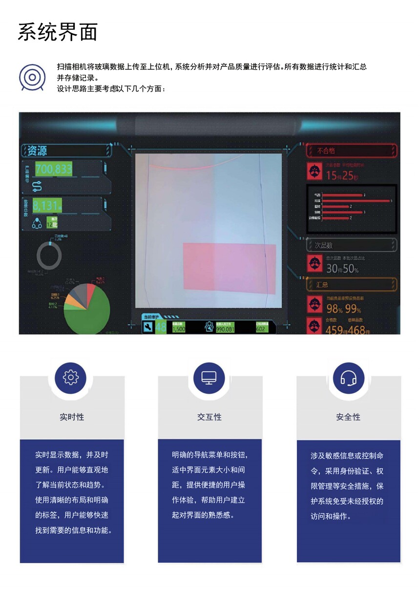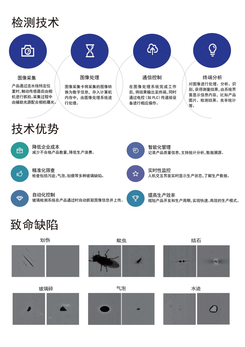 此玻璃檢測設備檢測精度0.1mm,檢 測速度10m/min,缺陷品檢出率 99.9%。支持檢測的缺陷類型包括點狀缺陷(氣泡、脫膜、針孔、結石、錫點等)、線狀缺陷(劃傷、劃痕、夾雜物、裂紋等)以及崩邊檢測。同時支持金屬表面缺陷檢測、無紡布瑕疵檢測、薄膜表面缺陷檢測