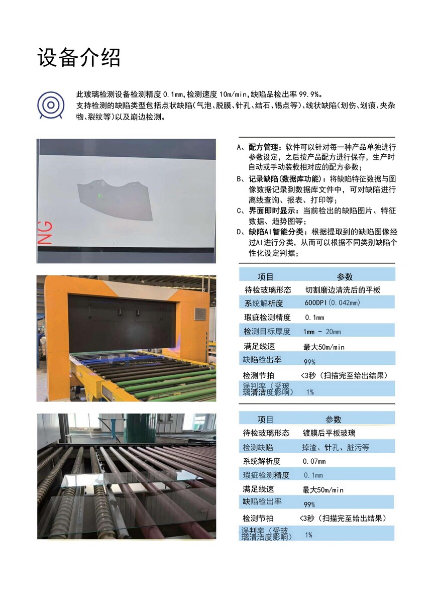 慶金公司新推出的智能AI自動玻璃檢測儀設備檢測精度0.1mm,檢 測速度10m/min,缺陷品檢出率 99.9%,可自主學習算法升級,越用越高效精度越高。